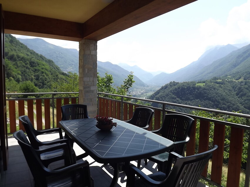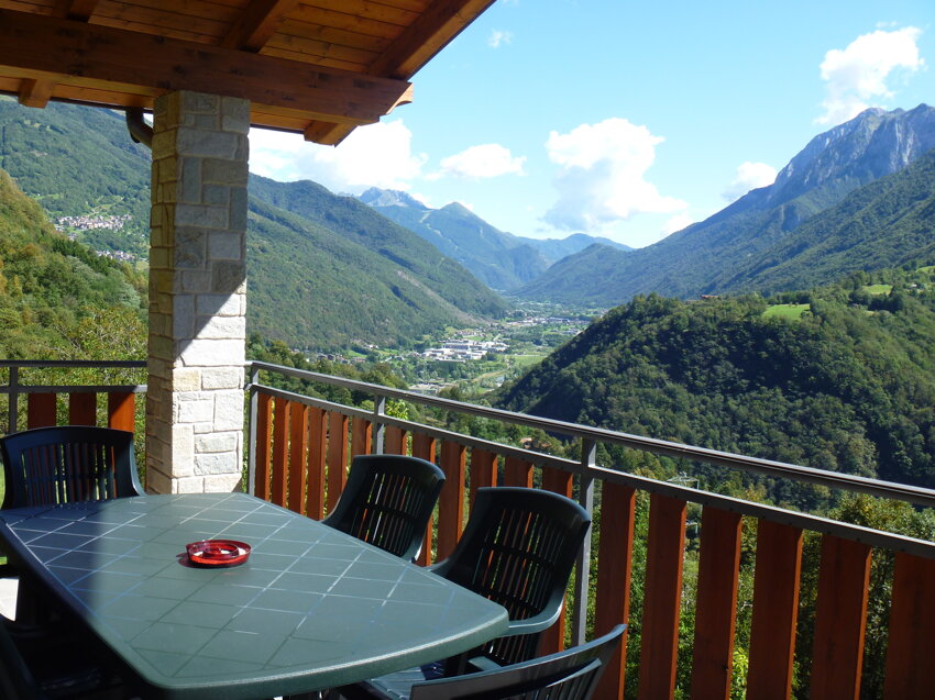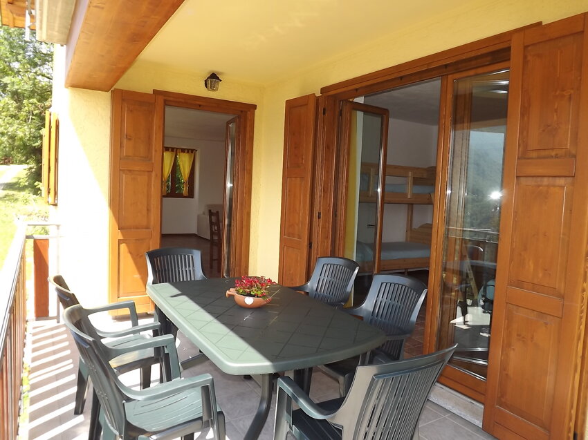 Ampia sala con cucina attrezzata, divano letto matrimoniale. Terrazzo coperto con tavolo e sedie.