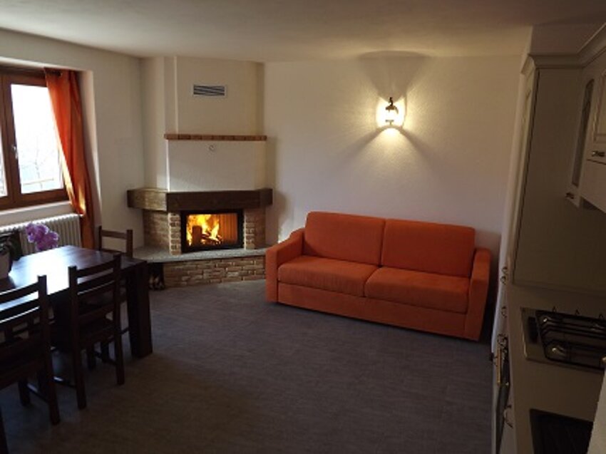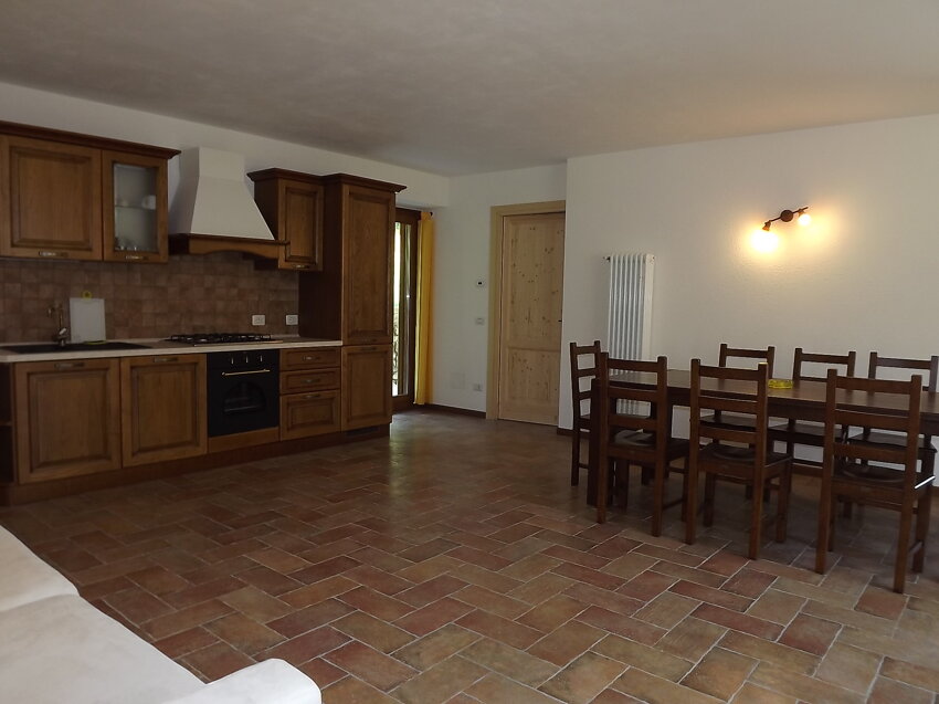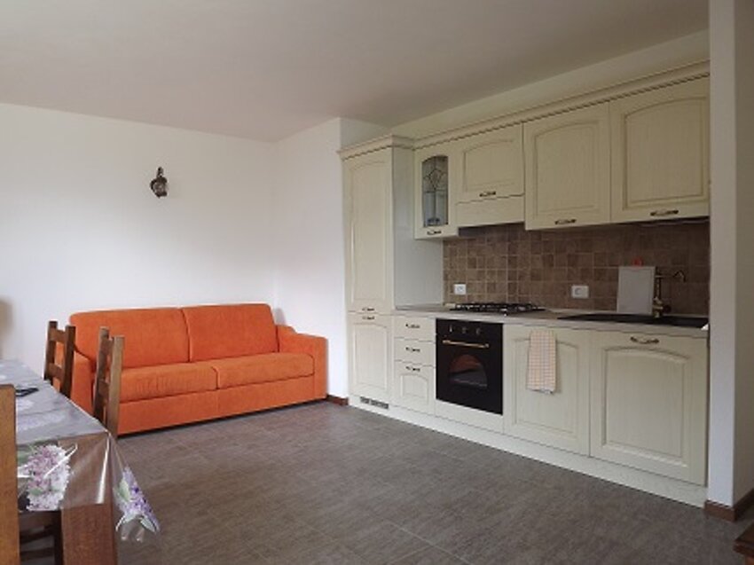 Sala con cucina attrezzata, divano letto matrimoniale. Ideale per famiglie di 3/4 persone.